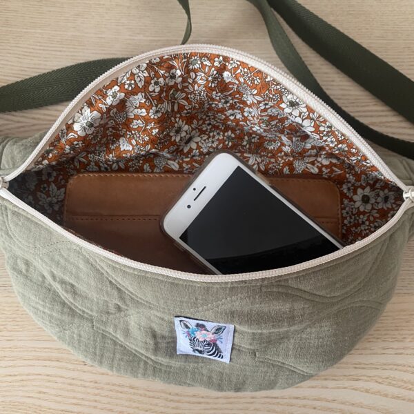 Réalisé en tissu matelassé kaki très doux pour l’extérieur et en coton fleuri sur fond brique pour l’intérieur.